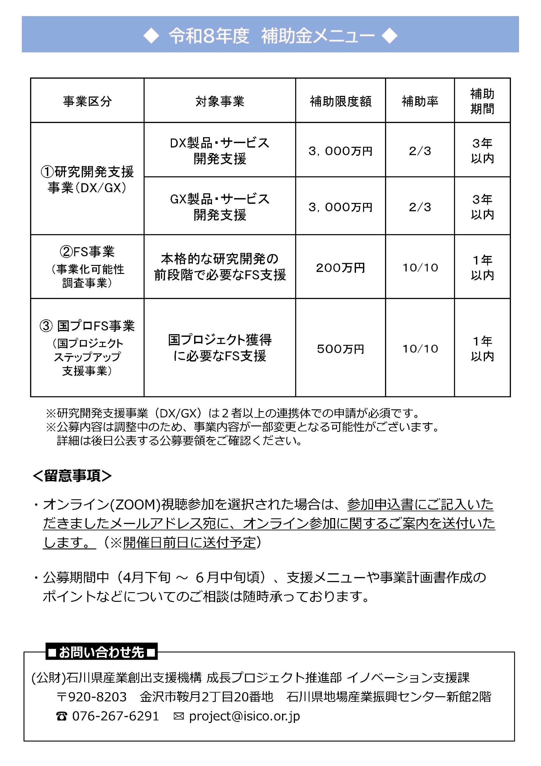 県では、700億円規模の「成長戦略ファンド」として研究開発支援、新商品・新サービス開発支援、スタートアップ創出支援等のメニューで、複数年にわたる新たな研究、商品開発から事業化、販路開拓まで、一貫して支援を行っております。 (参考)成長戦略ファンド:https://www.isico.or.jp/site/shinseihin/ R8年度は下記日程で公募説明会を実施いたしますので、関係者の皆様、研究開発・商品開発等に取り組まれる中小企業者等の皆様へ周知いただき、ご活用いただけましたら幸いです。 【公募説明会日程等】(詳細は添付のチラシをご覧ください) ●金沢会場(オンライン併用) 日時:4月22日(水) 10:30~11:20(研究開発支援事業) 13:30~14:10(新商品・新サービス開発支援事業) 会場:石川県地場産業振興センター 新館2階 第10研修室 定員:60名程度 ●加賀会場 日時:4月23日(木) 10:30~11:20(研究開発支援事業) 13:30~14:10(新商品・新サービス開発支援事業) 会場:小松商工会議所 1階研修室101号室 定員:30名程度 ●能登会場 日時:4月28日(火) 13:30~14:10(新商品・新サービス開発支援事業) ※研究開発は個別相談のみ14:15~16:15 会場:NOTOMORI(ノトモリ)(のと里山空港第一駐車場内) 定員:30名程度 【説明会申し込みフォーム】 ※分野で申込URLが異なります。 ※申し込み期限:4月20日(月)16時 <研究開発支援事業> 4/22金沢会場&オンライン https://www.isico.or.jp/ques/questionnaire.php?openid=477 4/23加賀会場 https://www.isico.or.jp/ques/questionnaire.php?openid=478 4/28能登会場(個別相談会のみ) https://www.isico.or.jp/ques/questionnaire.php?openid=479 <新商品・新サービス開発(全日程共通)> https://www.isico.or.jp/ques/questionnaire.php?openid=218<https://www.isico.or.jp/ques/questionnaire.php?openid=218&check>
